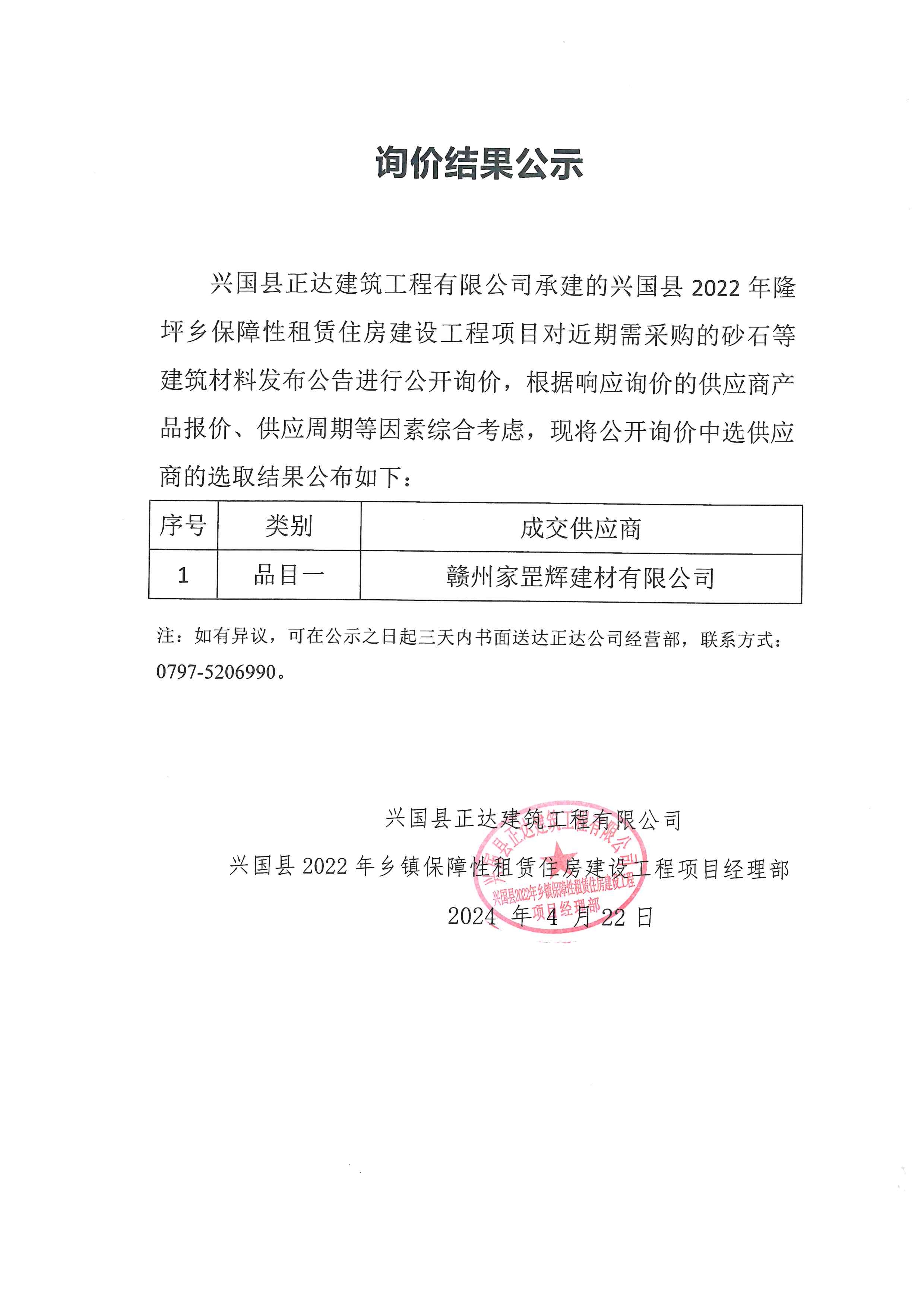 興國縣2022年隆坪鄉(xiāng)保障性租賃住房建設(shè)工程項(xiàng)目材料采購詢價(jià)結(jié)果公示