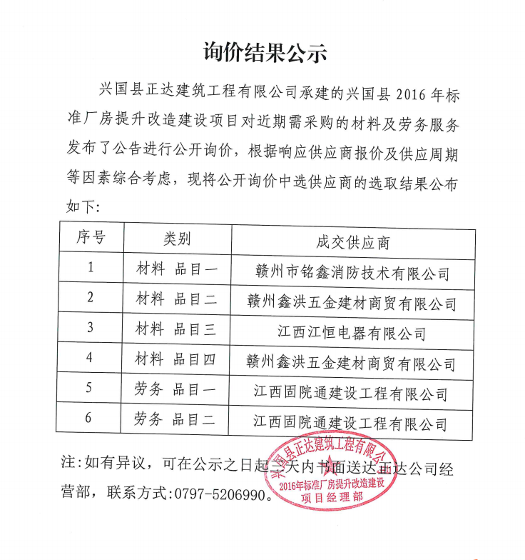 2016年標(biāo)準(zhǔn)廠房提升改造建設(shè)項目勞務(wù)、材料采購詢價結(jié)果公示